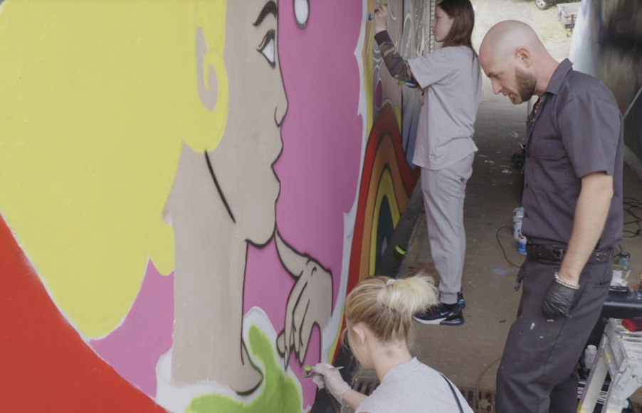 Devonport의 중간 도로 지하도는 낙서의 특별한 목표였습니다. 이를 막기 위해, 우리는 벽화 예술가 인 Robi Glimar와 함께 지역 학교의 학생들과 협력하여 지역 환경의 요소를 사용하여 밝고 화려한 벽화를 페인트했습니다.